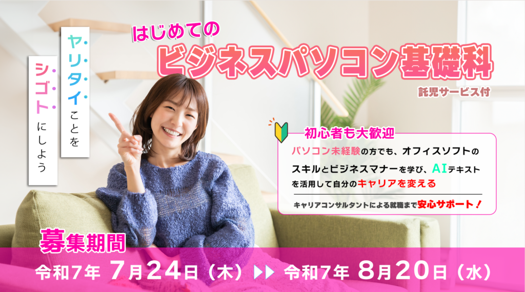 • 2025年7月24日お知らせ令和7年9月開講「初めてのビジネスパソコン基礎科」の受講生募集を開始します。