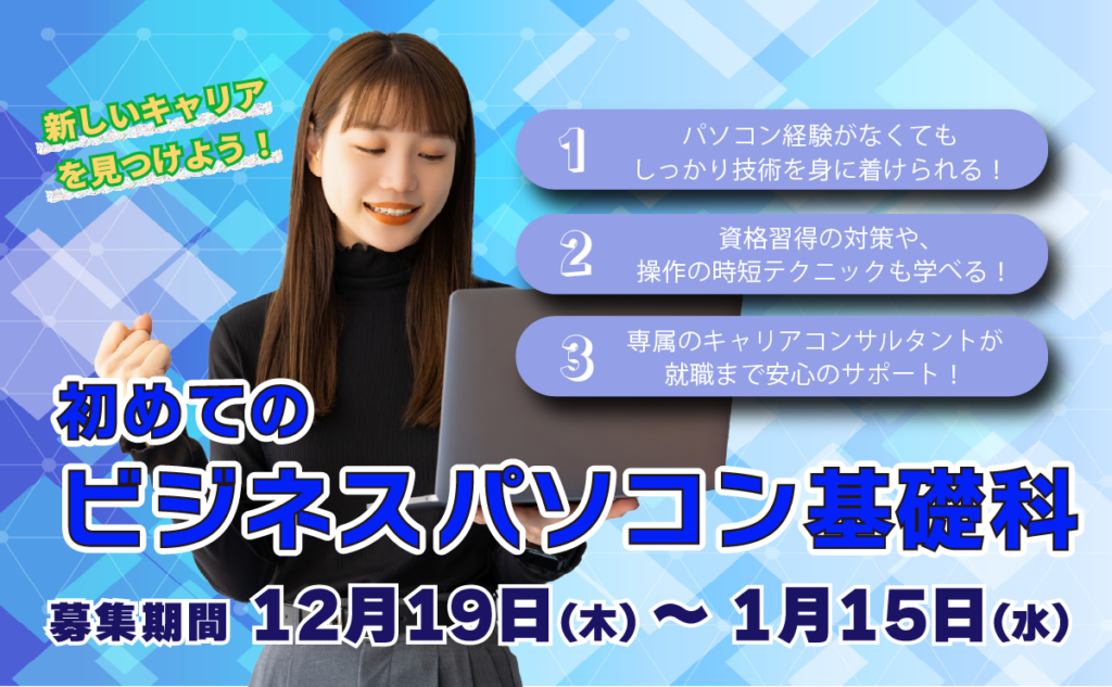 令和7年2月開講「初めてのビジネスパソコン基礎科」の受講生募集を開始します。説明会に参加する場合お気軽にご連絡ください。