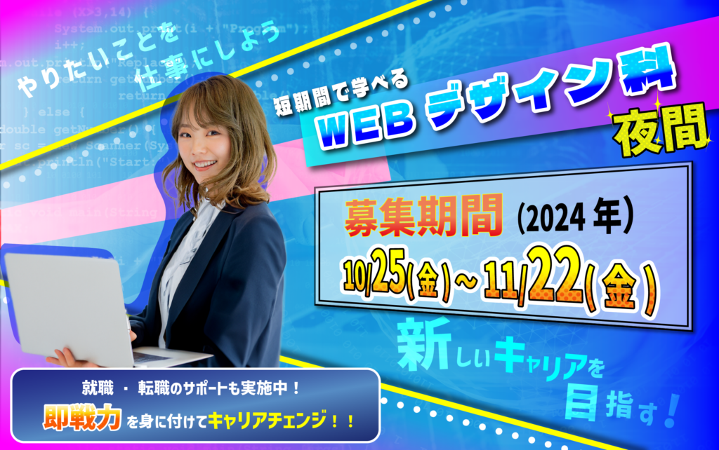 令和6年12月開講「短期間で学ぶWEBデザイン科(夜間)」の受講生募集を開始します。説明会に参加する場合お気軽にご連絡ください。