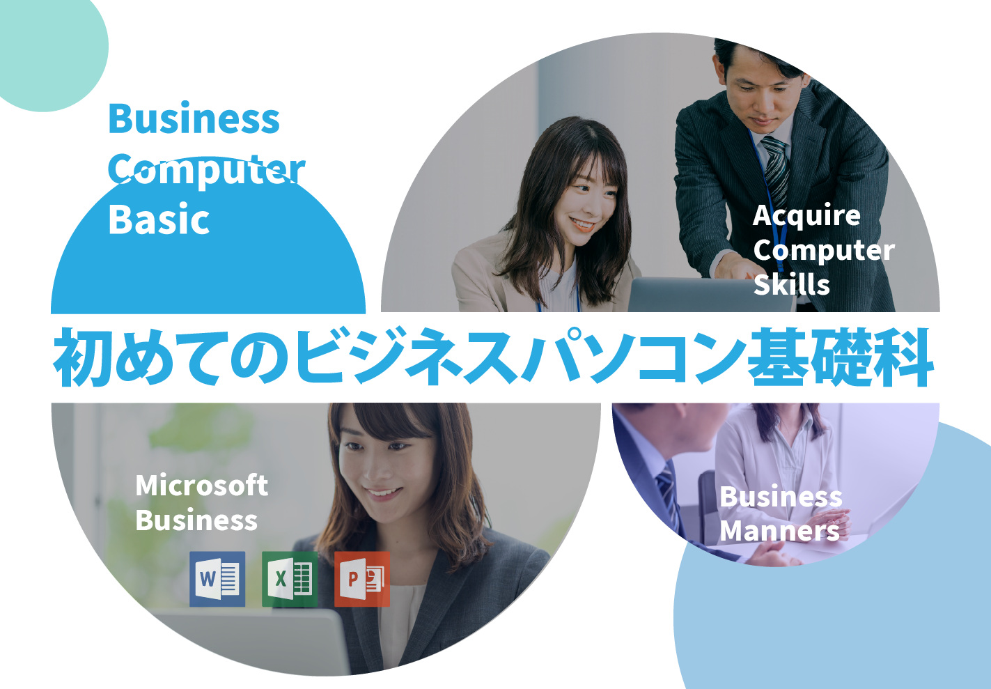 「初めてのビジネスパソコン基礎科」では、あらゆるビジネスシーンで必須となっているパソコンの操作を基礎から応用まで丁寧にわかりやすく指導していきます。